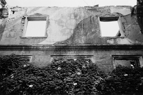 牆上的黨徽已褪色,屋頂也已毀損,但植物卻生意盎然的逐步進逼。
