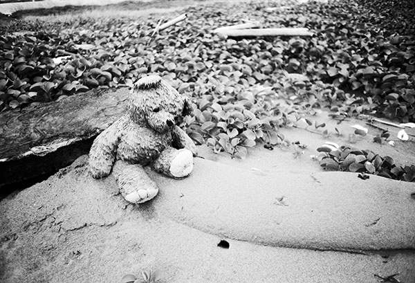 一臉無奈的小熊呆坐在海邊,什麼事也不知道,只會癡癡的等…….慘!