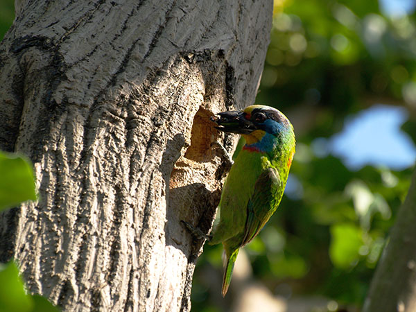 一般鳥類築巢的位置都偏向隱蔽處,很少像五色鳥這樣,隨便找棵樹就開始整修了。