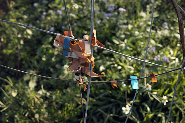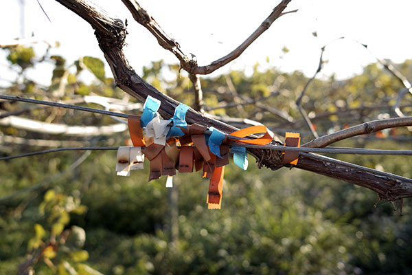 有橘色、藍色、白色等的標籤,密密麻麻的綁在葡萄樹上。