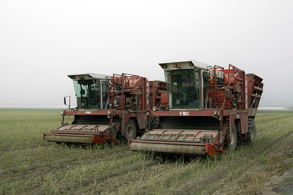 呵呵!運氣不錯,隔天就剛好看到兩台收割機停在毛豆田裡,趕緊趨近一看究竟。