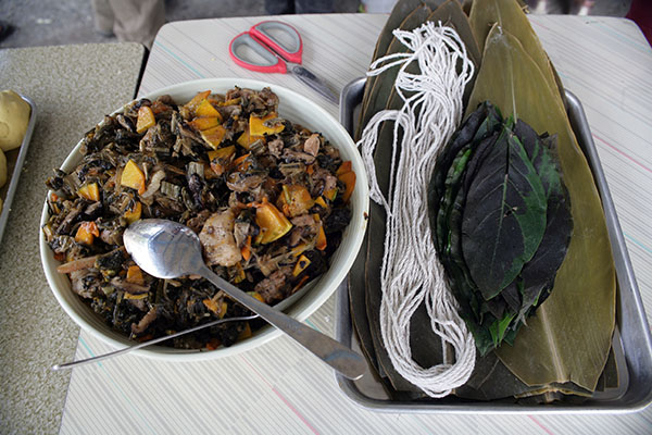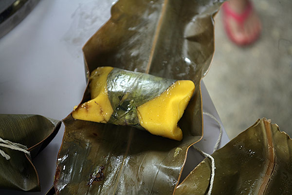 包好後將假酸漿葉包覆在外,接著用月桃葉包裹起來綁好即可送入蒸籠。