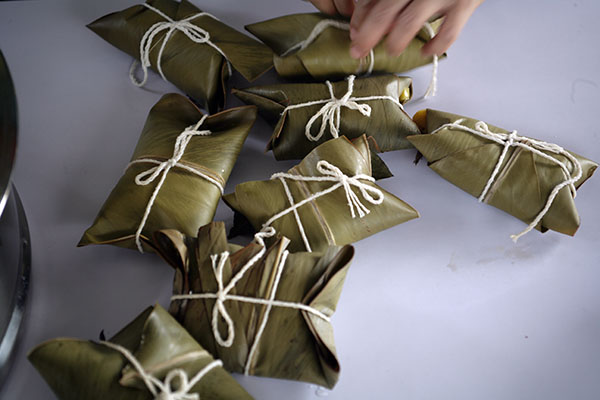 在綁的時候不能太緊,因為它在蒸的時候會膨脹起來。