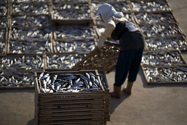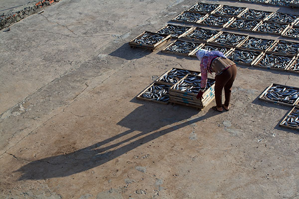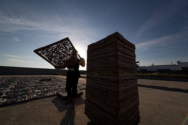 在開始收取魚乾之前,辛勤的阿桑們正在整理竹簍,