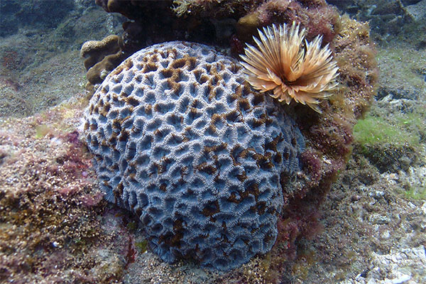 在排放管邊看到珊瑚旁邊長了一隻印度光鰓蟲。