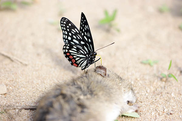 一隻美麗的紅星斑蛺蝶停留在死掉的刺鼠上面。