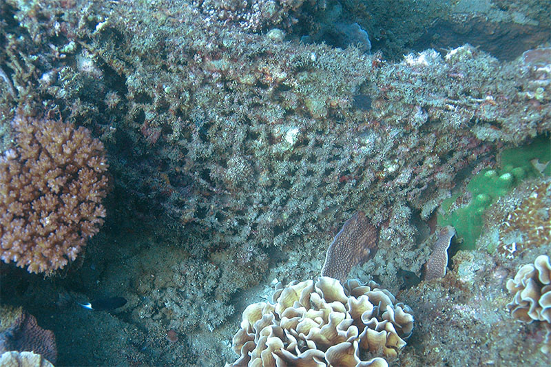 因為卡住的時間久遠,周遭均已被新生的珊瑚所包圍、覆蓋。