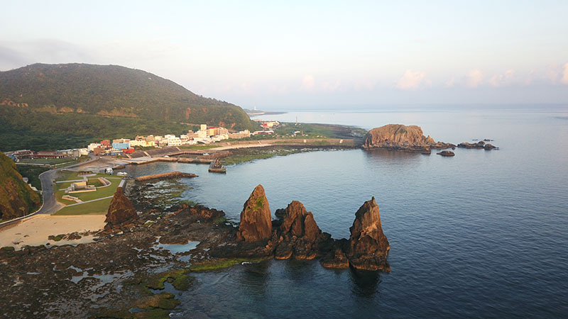 此時日出的光剛好照到三峰岩,港口後面是公館鼻,遠方還可以看到綠島燈塔。