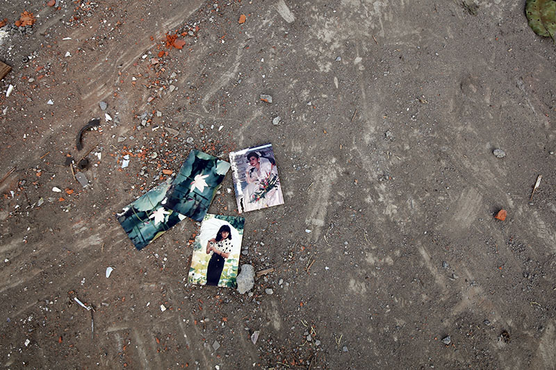 在拆除到一半的眷村中閒晃,突然看到店面上有著一疊照片,