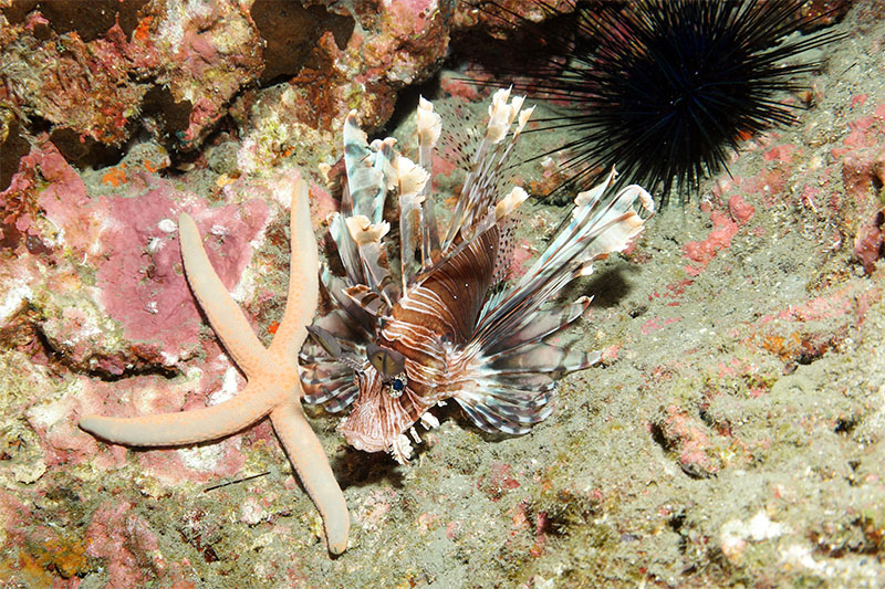 20170924 D166 獅子魚accentor2017 年 9 月 24 日201709, 第四次365 獅子魚 一開始這尾獅子魚吸引我注意的是他被兩隻棘皮動物給包夾。 一邊是藍指海星另一邊是海膽,只是還沒 key 是哪一種海膽。 拍起來之後才發現這尾獅子魚的眼睛好有戲喔! 一般來說魔鬼簑鮋的眼睛上方是會像扇子的構造沒有錯, 但是這尾的扇子開的好大,看起來很有喜感。 像不像古代站在皇帝後面搧的扇子?