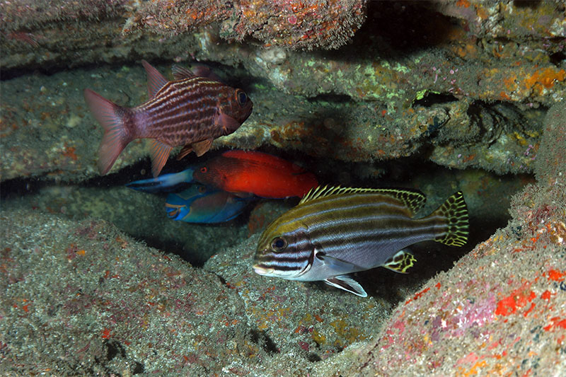 20170926 D168 一個洞穴各自表述accentor2017 年 9 月 26 日201709, 第四次365 一個洞穴各自表述 雙心石滬西邊的潛點發現一片很大的桌狀軸孔珊瑚,軸孔珊瑚的底下有著不小的洞穴。 拍照時只有看到雷氏胡椒鯛和巨齒天竺鯛,反正閃光燈就往裡面閃就是了。 結果回來看到照片才知道拍了那麼多魚。 前面最大尾的就是雷氏胡椒鯛,和胡椒蝦沒有關係喔! 明明就是石鱸科的,雷氏石鱸不是很好嗎?非得要和中國一樣改叫胡椒鯛嗎? 側身的那尾就是巨齒天竺鯛,紅色的是環眼准雀鯛,最後面的應該是藍頭綠鸚哥。 沒有拍到的還有疊波蓋刺魚。 這樣就知道這個洞穴裡面有多少魚了,真的是滿令人驚訝的!