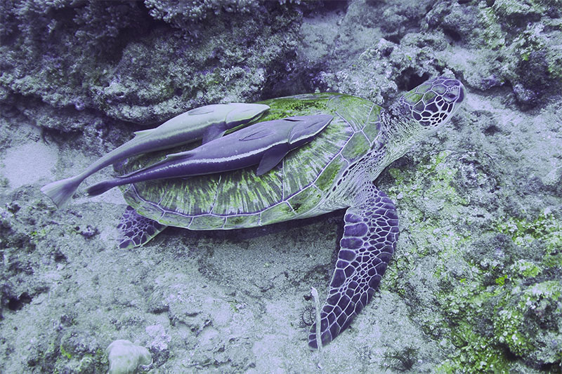 我看海龜多清潔一陣子,這兩尾鮣魚應該就會游走了吧?