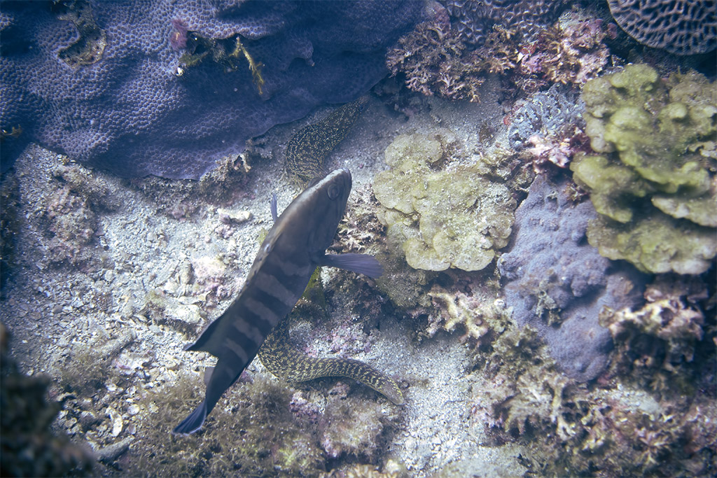Yse!!!一看就知道在協同狩獵,裸胸鯙鑽進洞裡,石斑在外面守候。