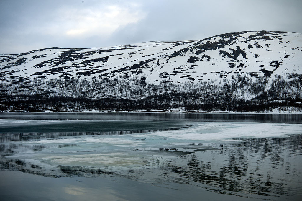 在看挪威的森林時,我就想到這個畫面,湖面有著薄冰,遠方的山都是積雪,