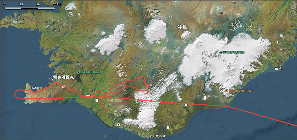 *請看下面那條直直貫穿冰島南部的紅線即可。從冰島最大的冰原南邊切進冰島。一直飛到首都機場南邊出海轉回降落*